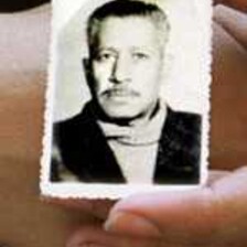Sabra and Shatila massacre survivor Hamad Mohammed Shamas holds a famous photograph taken in the aftermath of the massacres. He lay injured under the bodies on the left of the frame for a day and night. (Philip Reynaers)