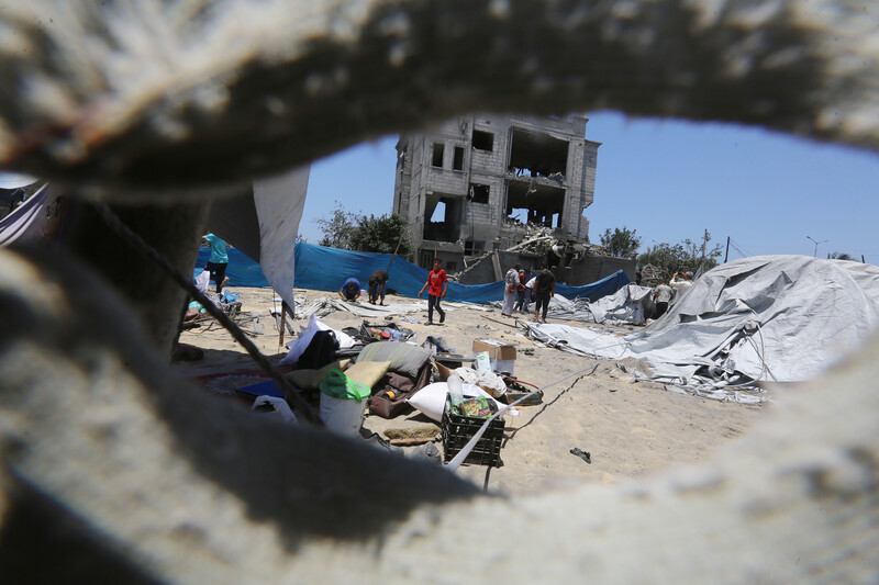 So-called safe zones, like al-Mawasi, where the author ended up with her father, are not spared Israeli bombardments. Here people relocate after an Israeli bombing in July.