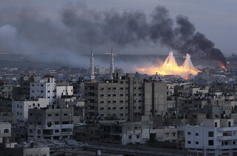 White phosphorus bombs explode over Gaza City on 8 January 2009.