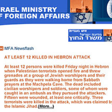 WOLF BLITZER: “As we told you at the top of the hour, a Jewish Sabbath celebration turned deadly in the West Bank today. Israeli authorities say at least 12 people were killed in Hebron when Palestinian militants opened fire on a group of Jews on their way to prayer services. CNN’s Matthew Chance is covering the story. He’s joining me now live from Jerusalem — Matthew.”Amos Harel writing in Ha’aretz on November 17th, stated:MATTHEW CHANCE: “Thanks, Wolf, and those are indeed the latest casualty figures that we have from the Israeli security forces saying that 12 people have been killed as a result of that Palestinian gun attack on the group of Jewish worshippers leaving, we’re told, the Tomb of the Patriarchs in central Hebron. They were set upon as they moved to the southern outskirts of the city, ambushed by those Palestinian gunmen.”