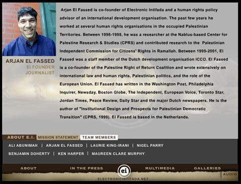 Sample screen in the informational section of the EI DVD, showing the bio of co-founder Arjan El Fassed.