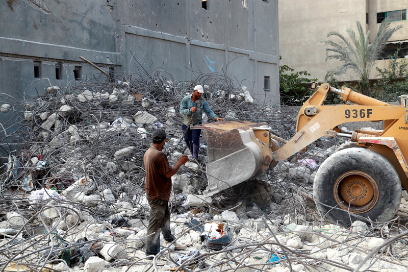 Palestinian workers remove rubble from a building destroyed by Israel’s attacks on Gaza in August 2021. Rubble is now being reconstituted into new building materials.