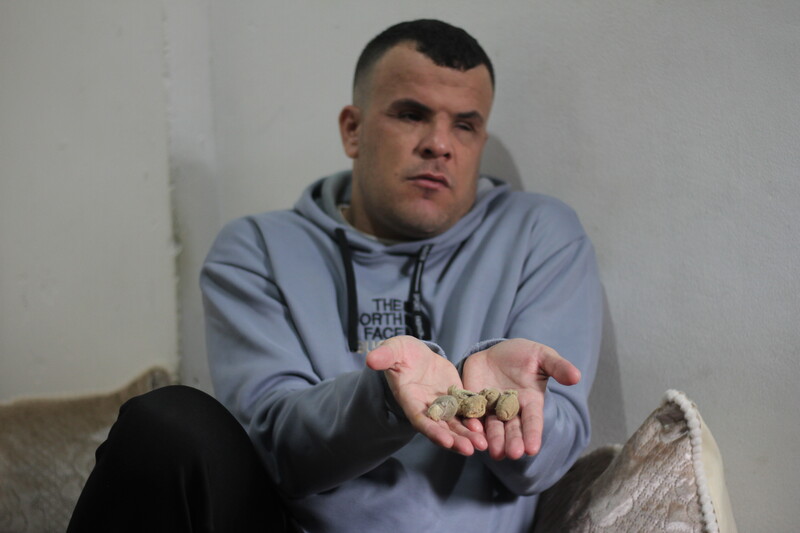 Khader al-Saidi holds some of the rubber-coated steel bullets that Israel’s navy fired at him.