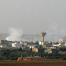 An Israeli Apache helicopter swoops towards northern Gaza and drops missiles on Beit Hanoun, leaving a plume of dust and destruction in its wake.