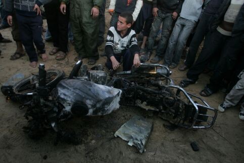 Palestinians surround a destroyed motorcycle following an Israeli air strike in Khan Younis, 11 January 2011. (Khaled Omar/Xinhua)