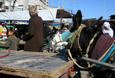 A donkey cart in Khan Yunis market. (Arjan El Fassed)