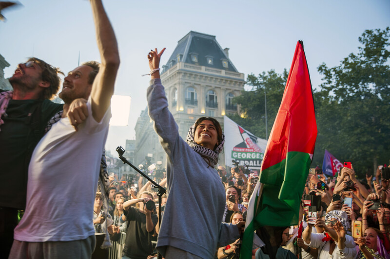 Rima Hassan, a French-Palestinian European Parliament member, along with Baptiste André and Reva Seifert Viard, in Paris on 12 June. All three were passengers on the Madleen ship and abducted by Israeli commandos in international waters while attempting to break the siege on Gaza earlier in the month.