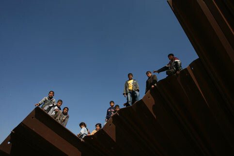 Palestinian children play on top of the bombed metal fence that used to separate the Gaza Strip and Egypt at Rafah, 24 January 2008. (Wissam Nassar/MaanImages)