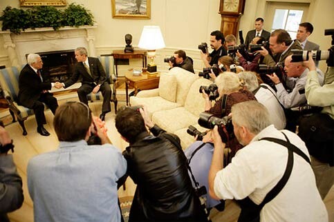 President George W. Bush shakes hands with President Mahmoud Abbas of the Palestinian Authority Thursday, May 26, 2005, as the press records the moment in the Oval Office of the White House. (Photo: White H