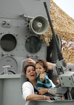 A mother with her young daughter, being evacuated by a US war vessel from Beirut’s port, 19 July 2006. (Haitham Moussawi/IRIN)