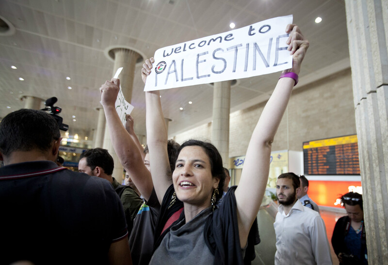 Israeli activists were arrested for holding “Welcome to Palestine” signs at Ben Gurion airport on Sunday.