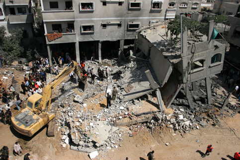 Palestinians search for survivors in a three-storey building that was brought down in an Israeli strike in Gaza City, 12 July 2006. At least nine Palestinians were killed by the strike which targeted Hamas activists in Gaza City on Wednesday. (MaanImages/Wesam Saleh)