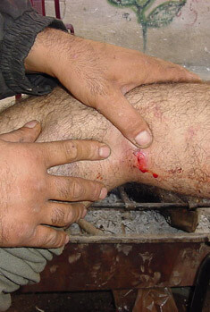 A member of the al-Ahtamina family suffers a fresh shrapnel wound on top of old wounds from the previous week. (Dr. Bill Dienst)