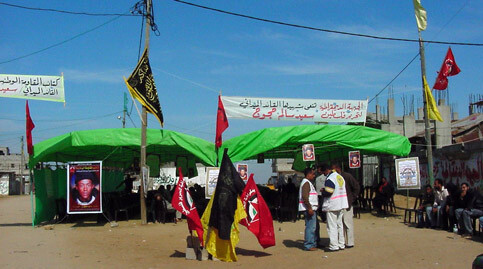 As we approach the wake, we see a banner from Democratic Front for the Liberation of Palestine (DFLP) which reads in Arabic, “We promise our martyr to continue the Intifada to build the Palestinian State and free Jerusalem.”