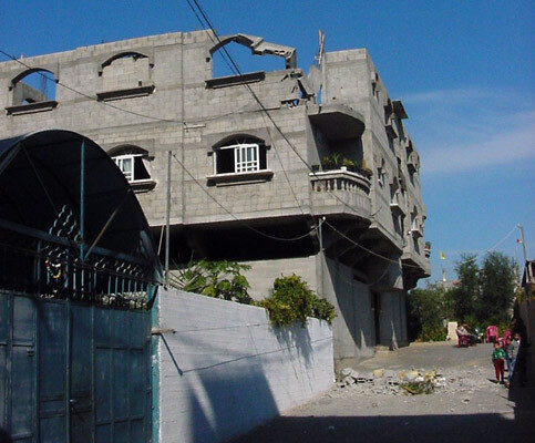Abu Zahid’s apartment in Beit Lahiya; the top floor was hit by either tank shells or missiles by Israel the morning the photo was taken. (Dr. Bill Dienst)