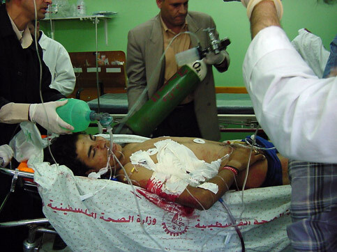 Muheed Suleiman, age 20, suffering from a large gunshot wound to his right chest, was resuscitated from hemorrhagic shock at Kamal Adwan Hospital. He was transferred to al-Awda Hospital for emergency surgery because Kamal Adwan’s operating rooms were full with other trauma victims from the Israeli tank and Apache attack helicopter assault. (Dr. Bill Dienst)