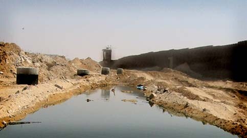 An iron wall on the right, a line of rubble from destroyed homes on the left, one of many toxic untreated human waste in the foreground are all that remains in this part of the Block “O” refugee camp in Rafah. A mobile IDF watchtower in the distance looms over the remaining homes. (Mark Zeitoun)