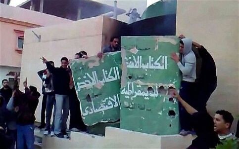 A screen grab of a YouTube clip showing protesters in eastern Libya destroying monuments of Gaddafi’s Green Book.