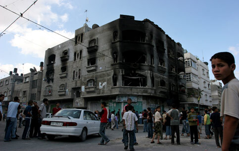 Palestinians gather near a burnt building housing the senior Fatah leader, Jamal Abu Al-Jidyan, after fighting between Hamas and Fatah militants in the northern Gaza Strip, 12 June 2007. (Wissam Nassar/MaanImages)