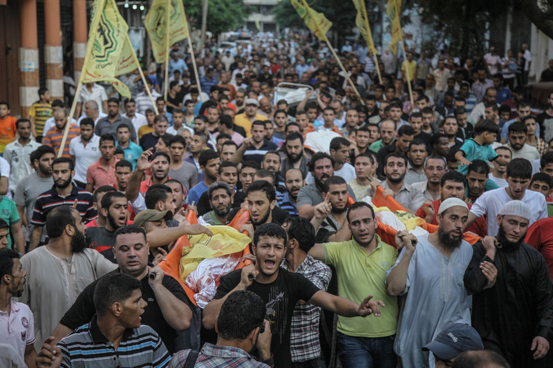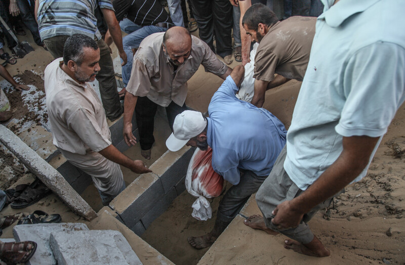 Mourners carry the bodies of five members of the Jouda family during their funeral procession on 24 August.