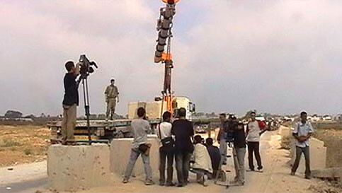 And we ran through the checkpoints, from one military sniper tower to the other, where they had begun to remove the roadblock that divides the settler road from the Palestinian road on Salah el-Deen Street. We ran past the meter-cubed concrete roadblocks, past the crane, past the journalists and the crowd and the cars, until we found a table with an old woman selling cola and snacks. We filled our dried-out, sun-tired bodies with warm cola, and she let us pour her washing water over our hair, and it was a perfect day again. We ran back, climbing with the other journalists on the roadblocks that remain, trying to get a better view. It was the biggest party in the Gaza Strip since the beginning of this Intifada.