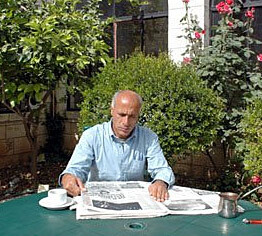 Mordechai Vanunu reads a newspaper in the grounds of the Anglican cathedral of St George’s, East Jerusalem. (Meir Vanunu)