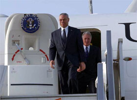 Secretary Powell is escorted down the ramp upon his arrival at Ben Gurion Airport by the Chief of Protocol from Israel’s Ministry of Foreign Affairs, Ambassador Uri Halfon, 10 May 2003. (US Embassy)