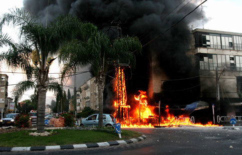 Flames are seen after a Katyusha Rocket slammed into a building in the northern costal town of Nahariya 13 July 2006. (MaanImages/Moti Milrod)