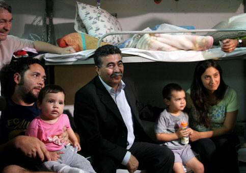 Israeli Defense Minister Amir Peretz (C), visits Israelis in a bomb shelter in the Israeli northern coastal town of Nahariya 17 July 2006. (MaanImages/Moti Milrod)