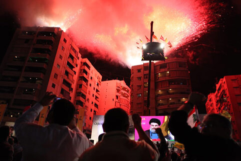 Hizballah supporters cheer as Hassan Nasrallah delivers a speech in the southern suburbs of Beirut, May 2009. (Matthew Cassel)