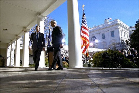 President George W. Bush and Secretary of State Colin Powell walk back to the Oval Office after addressing the media in the Rose Garden Friday, March 14, 2003. The President discussed an outline for peace in the Middle East. (White House/Paul Morse)