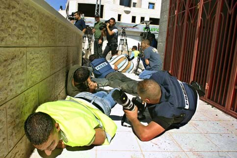 Journalists take cover from Israeli soldiers’ gunfire during an invasion of the West Bank city of Ramallah, August 10, 2006. (MaanImages/ Fadi Arouri)