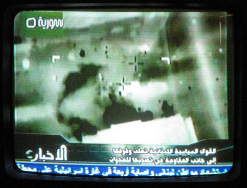 Syrian Mubashir TV images of Israeli TV images of Israeli airforce bombcams showing the bombing of Beirut. In the Arab world not to mention in Lebanon itself people were glued to their television sets in horror at Israel’s decimation of the civilian infrastructure. (EI)