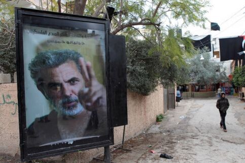 A portrait of Juliano Mer-Khamis hangs outside the Freedom Theatre where he was killed one day earlier. (Anne Paq/ActiveStills)