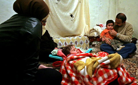 Iraqi refugee Sarah looks at her sleeping daughter Rand as her husband plays with their son 21 March 2007 in a dark and damp room of an aparment in Beirut’s Christian suburb of Dikwaneh which is housing her and her family. Sarah fled war-torn Iraq along with her husband and eight other members of her family a few months ago after her father, an official in the Iraqi education ministry, was shot dead as he was walking out from a school. She and her family are among the thousands of Iraqis living in difficult conditions in Lebanon, desperately awaiting the UN High Commissioner for Refugees (UNHCR) to transfer them to a European country. (Marwan Naamani/AFP/Getty Images)