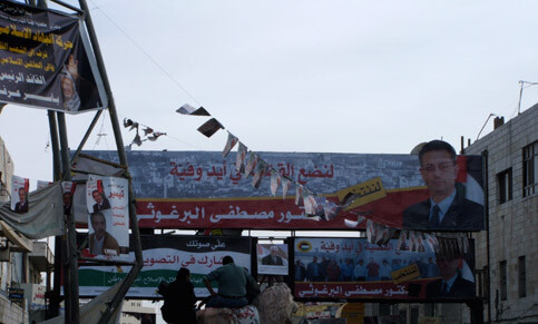 Empty spaces in the streets of Ramallah compete for election posters. (Maureen Clare Murphy)