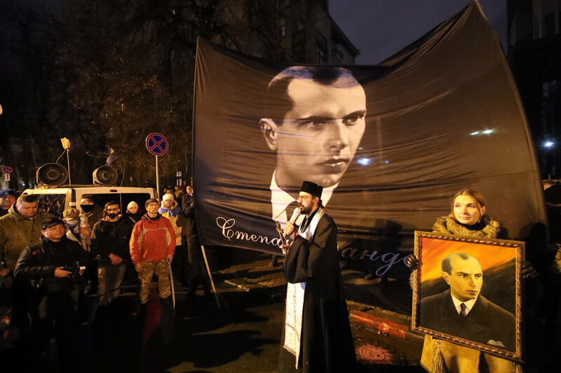 A priest delivers a speech during a torchlight procession honoring Nazi collaborator Stepan Bandera in the Ukrainian capital Kiev on 1 January 2022. Bandera’s nationalist movement directly assisted German occupation forces in perpetrating the Holocaust during World War II.