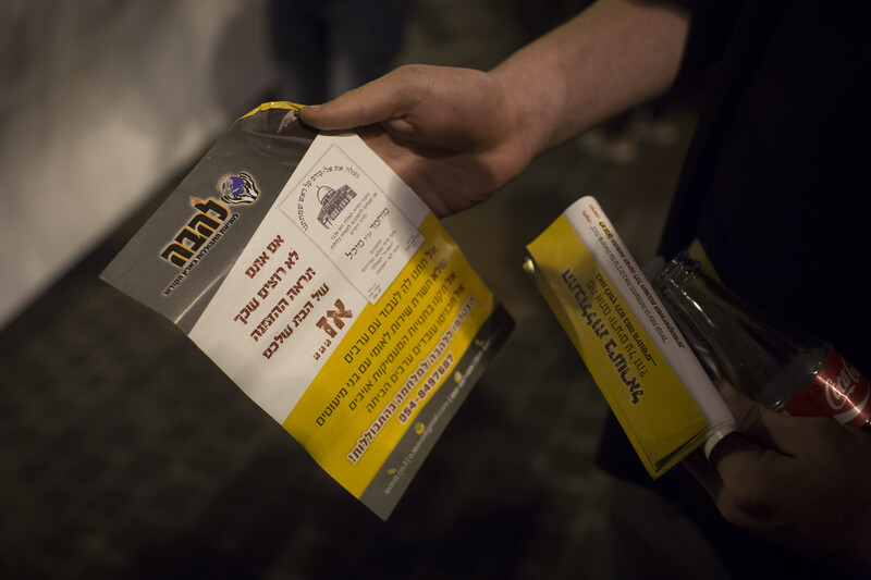 Right-wing activists distrubte flyers urging Israelis to “Join Lehava in the war on miscegenation” in Jerusalem in October 2014.
