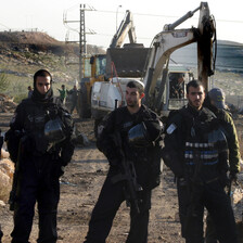 Residents of Beit Safafa protest the four-lane highway which that will cut through their town in Jerusalem, 16 January. The road is being constructed on privately-owned land designated for building houses in the densely-populated town and will connect the various Jewish settlement colonies in the Hebron area to Jerusalem.
