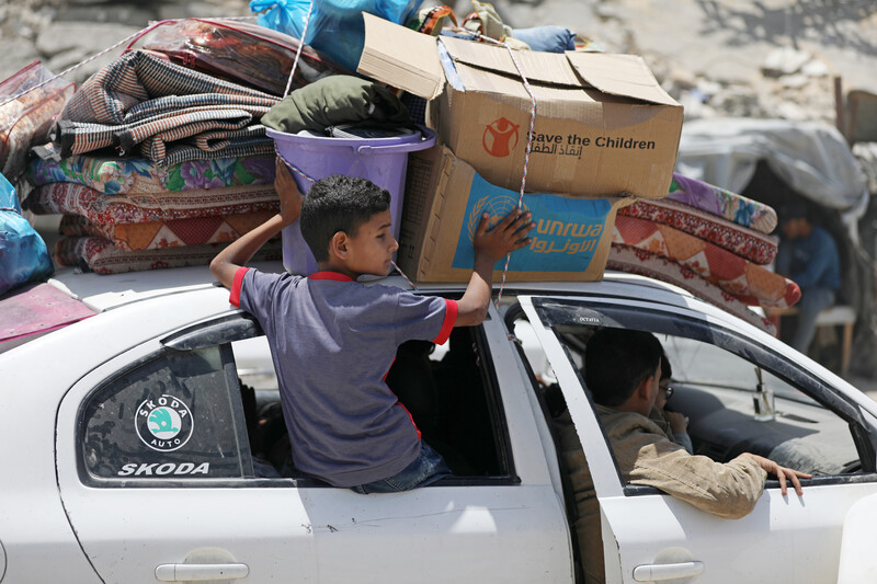 A Palestinian family that fled north Gaza arrives in Gaza City on 16 May.
