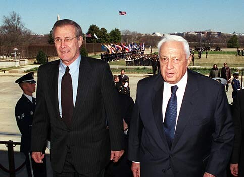 Secretary of Defense Donald H. Rumsfeld (left), escorts Israeli Prime Minister Ariel Sharon (center) into the Pentagon at the conclusion of a full honor arrival ceremony for Sharon at the Pentagon, 19 March 2001. (Photo: Do/R. D. Ward)