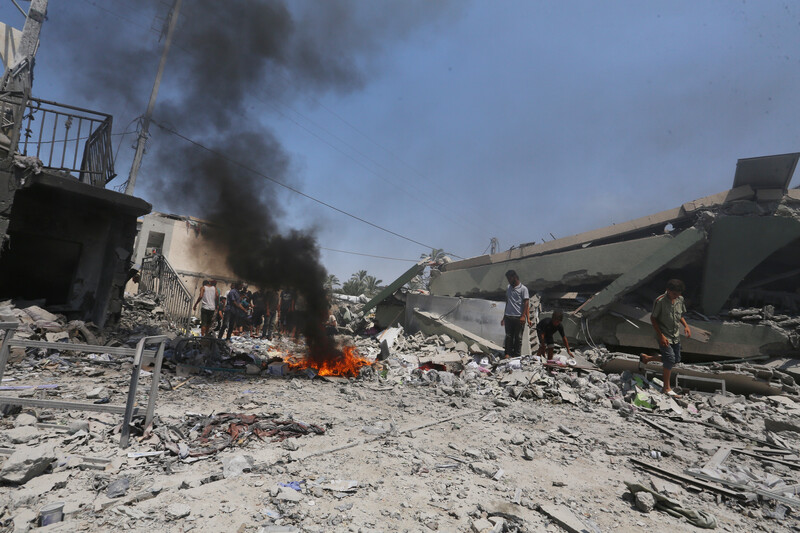 Palestinians inspect the rubble of a school destroyed by an Israeli strike in in Deir al-Balah in the central Gaza Strip, 27 July.