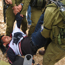 Israeli soldiers detain a Palestinian youth following a weekly protest against the occupation in the West Bank village of Bilin in December 2013.
