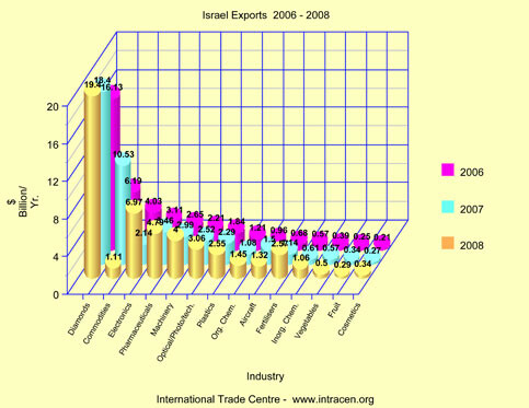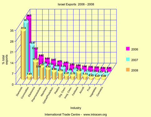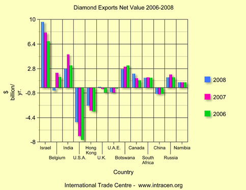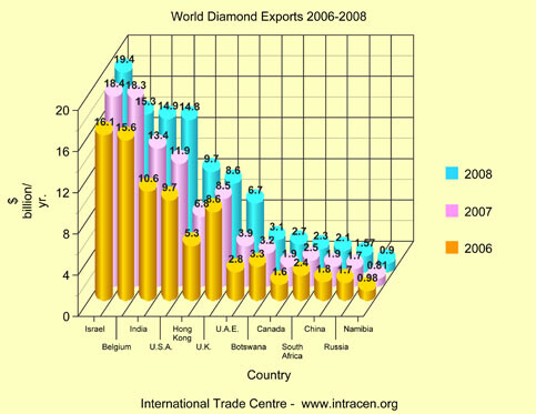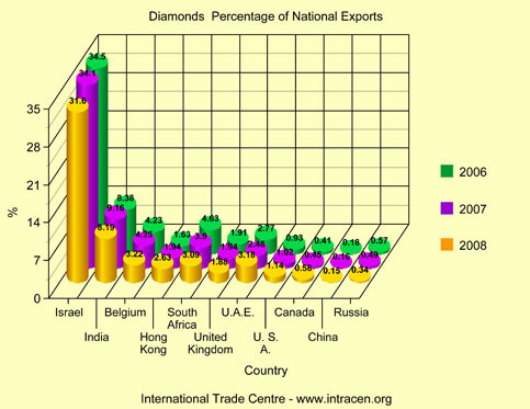 The WDC website is equally selective when it comes to providing information about which countries are most dependent on diamonds. It explains that Namibia, one of the minor diamond exporting countries in monetary terms, derives 40 percent (Trade Performance HS: Exports of Israel” accessed 25 March 2010) (See Figures 3 and 4). By comparison, the budget for Israel’s Ministry of Defense was $16 billion in 2008.
