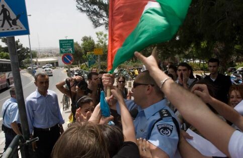Israeli police officers confiscate a Palestinian flag during a protest at Hebrew University, May 2008. (Oren Ziv/ActiveStills)