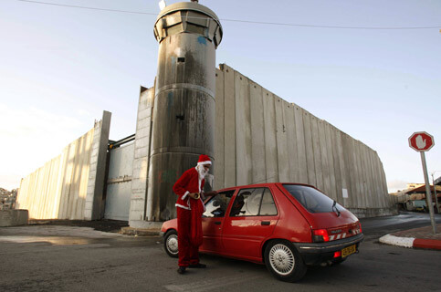 A Palestinian dressed as Santa Claus near the controversial separation wall in the West Bank city of Bethlehem, 23 December 2006. (MaanImages/Moamar Awad)