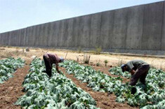 Original caption: Palestinian farmers tend to their aubergine crop in the shadow of a concrete wall erected across their land by the Israeli army to stop Palestinian militants slipping into Israel from the West Bank city of Qalqilya July 7, 2003. Palestinians fear the barrier, consisting of walls and electronic fences now stretching around 150 kms (90 miles), will dash their dream of a viable state in the West Bank, the goal of a new U.S.-backed peace plan. (Reuters/Mahfouz Abu Turk)