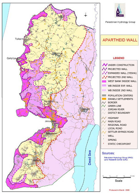 A Palestinian-compiled map of the Israeli barrier plans from the Palestinian Hydrology Group and the Land Research Center. EI altered the legend text for greater clarity.