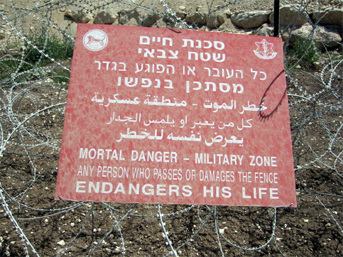 Israeli ‘shoot to kill’-style warning sign on part of the separation barrier. As expected, the Hebrew word for the barrier is gader (“fence”). However, the Arabic word used is jidar, which — while related at its root to the Hebrew word gader actually means “wall” in Arabic. (ISM)