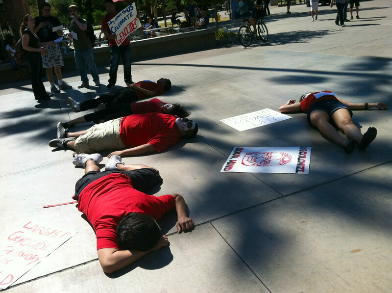 In the torrid 90-degree midday heat, a group of about ten M.E.Ch.A. students lay down in the middle of the 70,000-student Arizona State University. Wearing red shirts and skulls painted on their faces, students used the tradition of macabre and theater of the oppressed to dramatize the memory of millions of Native Americans murdered by European settlers and slave-traders who invaded the “New World,” beginning with Columbus in 1492.